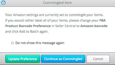 If you choose to update your preference, you will be taken to the barcode settings page in Seller Central. Once you change the setting and return to InventoryLab, a new [SELLER_LABEL MSKU]{#77D4FC will be created once you choose to add it to your batch. If you continue as commingled, your item will add to your batch as NO_LABEL.